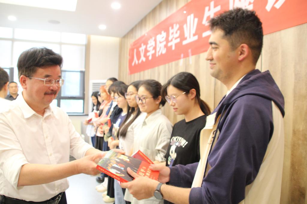 在热切交流与掌声中,刘久明依次为毕业生代表赠送《习近平与青年大学生们》一书并合影留念,祝福同学们拥有似锦前程,奔赴熠熠生辉的新征程。