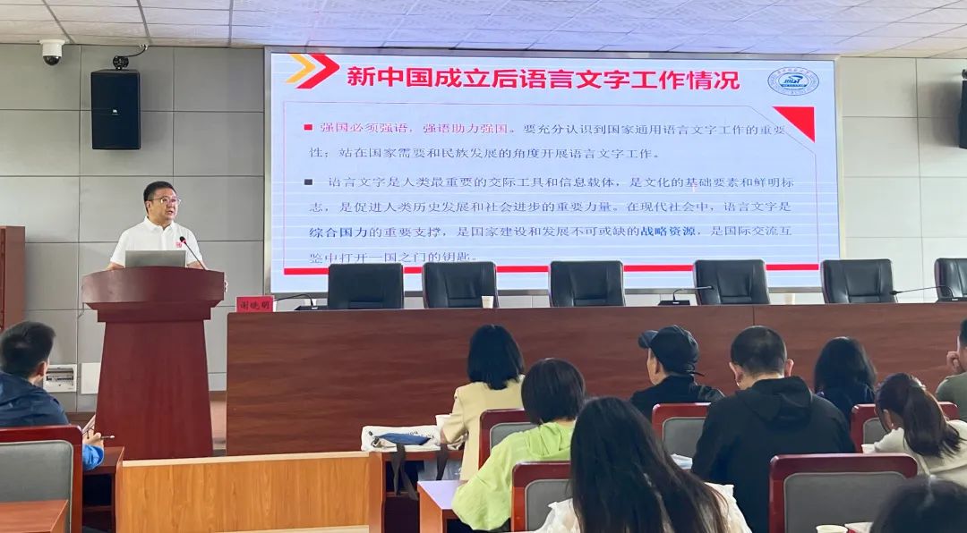 开班仪式结束后,基地副主任谢晓明教授为参训教师带来以“推广国家通用语言文字,铸牢中华民族共同体意识”为主题的培训第一课。谢教授从国家通用语言文字内涵、新中国成立后语言文字工作情况、推广国家通用语言文字的必要性及民族地区如何推广国家通用语言文字4个方面展开了细致讲解。