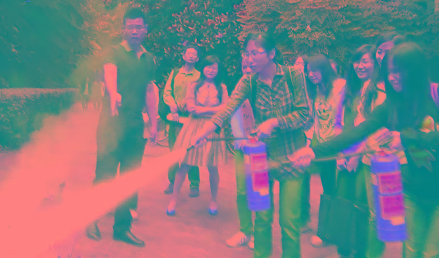 会后,李教官带领大家来到东五楼门口,开展消防灭火现场演习,还现场讲解了灭火器的使用方法,总结为四个字就是提、拔、瞄、压,注意事项是不能倒置使用并且不可手托底部,一经使用必须重新装粉加压。组织人员点燃提前准备好的干菜后,同学们在教官的指导下,用两个干粉灭火器将火迅速扑灭,消防演习获得完满成功。