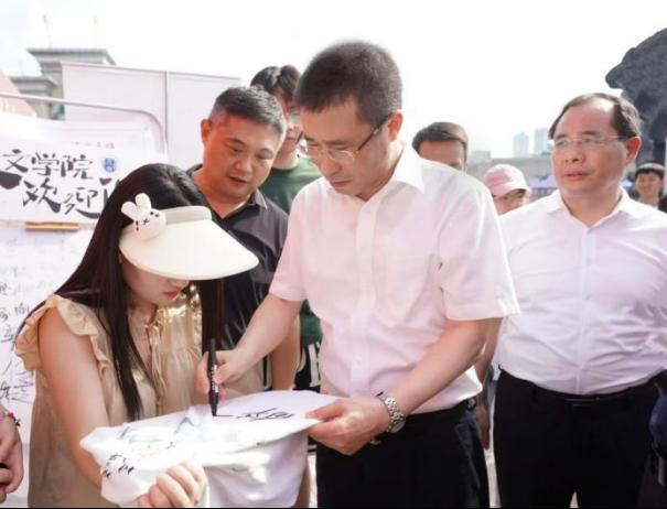 校党委书记张广军一行亲临学院迎新现场,与新生们进行了亲切交流,并慰问了现场的工作人员与志愿者团队。张书记对我院在历史文化资源创造转化及创新发展方面所取得的成就给予了高度肯定,并鼓励新生们要知行合一,努力成为一名优秀的人文人才。同时,张书记还为新生们题写了“奋斗青春”的寄语,寄寓了对他们美好未来的深切期望。