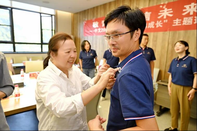与会老师与校友们一起回忆往昔,寄语未来,并为校友佩戴院徽。