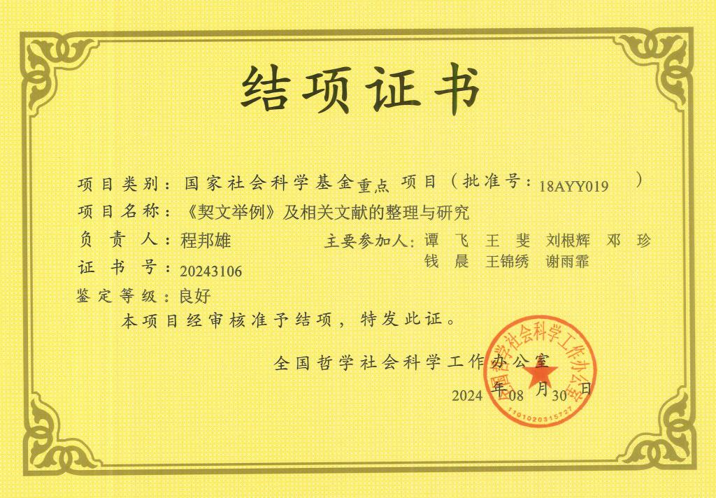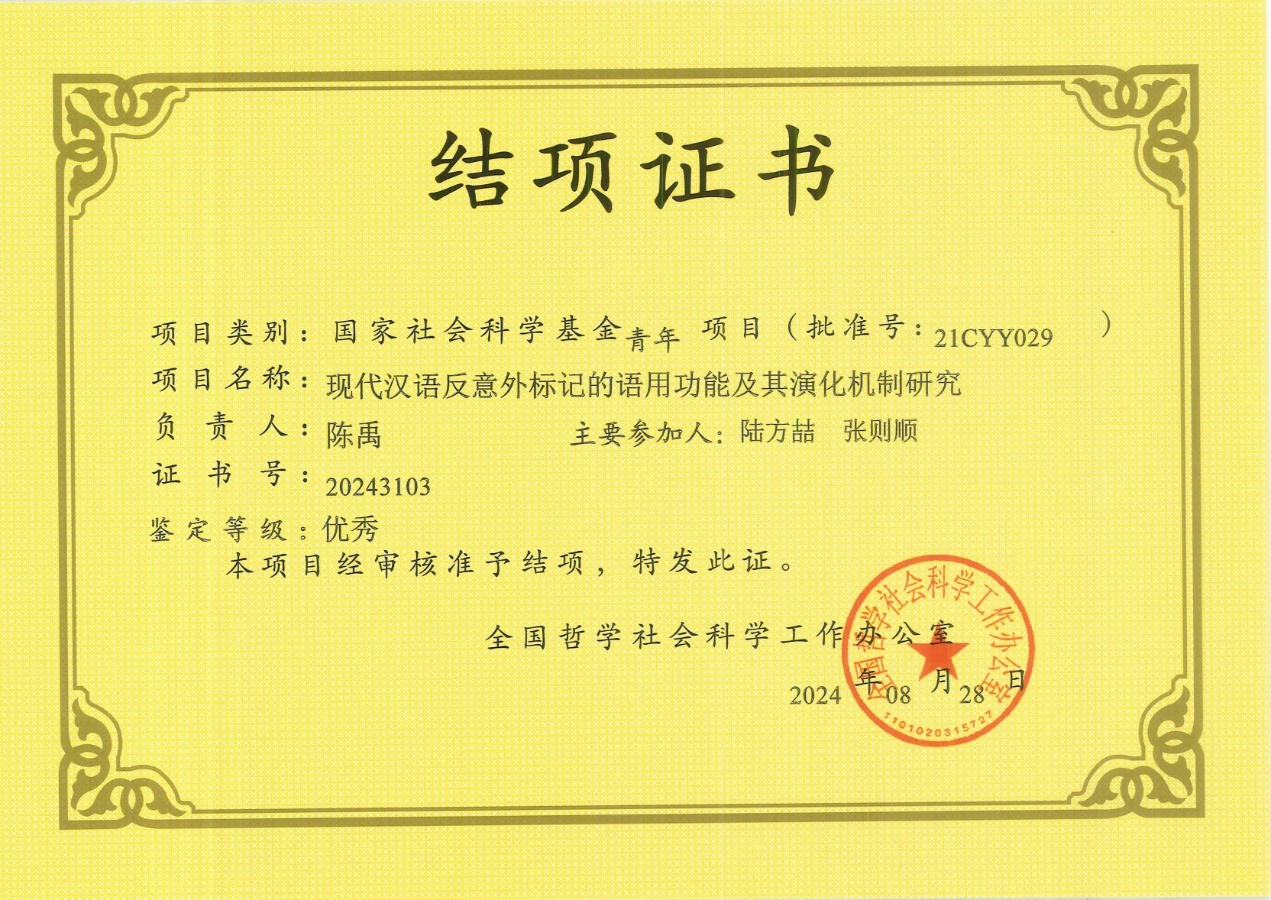 近日,全国哲学社会科学工作办公室公布《2024年8月国家社科基金年度项目、青年项目和西部项目结项情况》。我院程邦雄教授的国家社科重点项目“《契文举例》及相关文献的整理与研究”、陈禹副教授的国家社科青年项目“现代汉语反意外标记的语用功能及其演化机制研究”顺利结项,陈禹副教授的结项成果获“优秀”等级。
