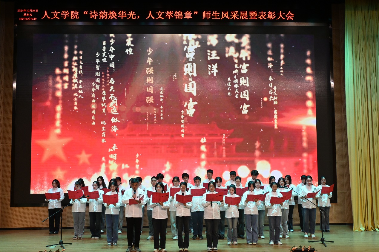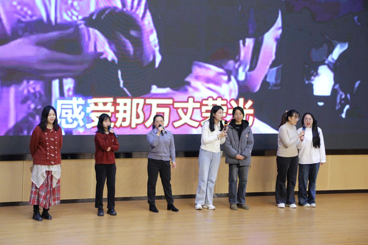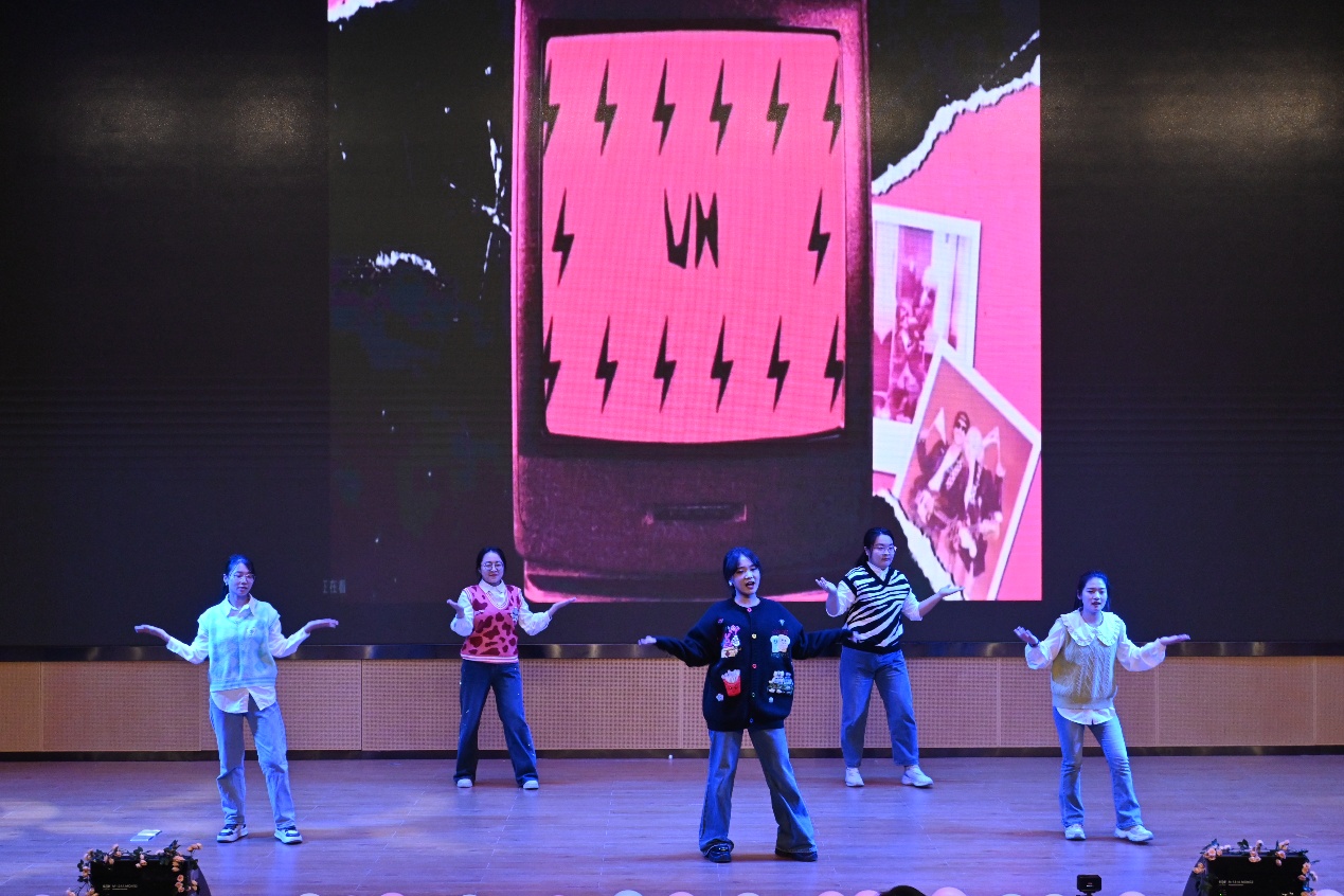 党委副书记叶智和24级本科生代表齐诵共唱《少年中国说》,字字激昂、振奋人心。辅导员和德育助理完美演绎的《如愿》以及群舞《APT》等节目也让人感受到了深深的情感与活力。陈禹等青年教师合唱的《New Boy》及群舞《forever young》展现了青春活力与激情。压轴小品《研一生存指南》以诙谐的语言和自然的演技,提醒大家谨防电信诈骗、践行学术诚信。