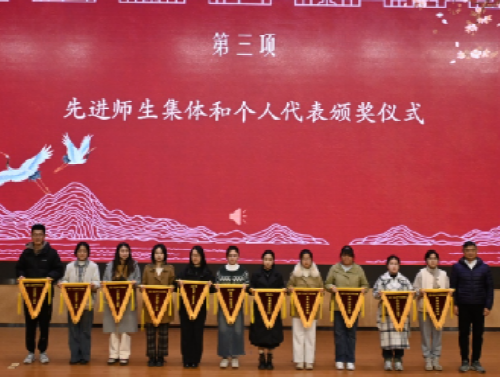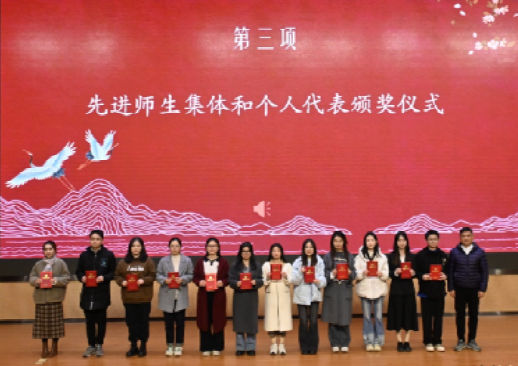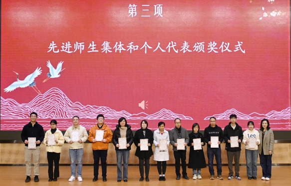 太阳成集团tyc33455党委副书记叶智宣读《太阳成集团tyc33455关于表彰2023年及2024年先进集体和先进个人的决定》,对在学院建设工作中表现突出的优秀集体和个人进行了表彰。刘婵娟、叶智为优秀教师代表和优秀学生代表颁奖。