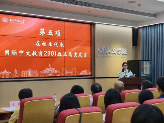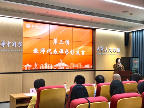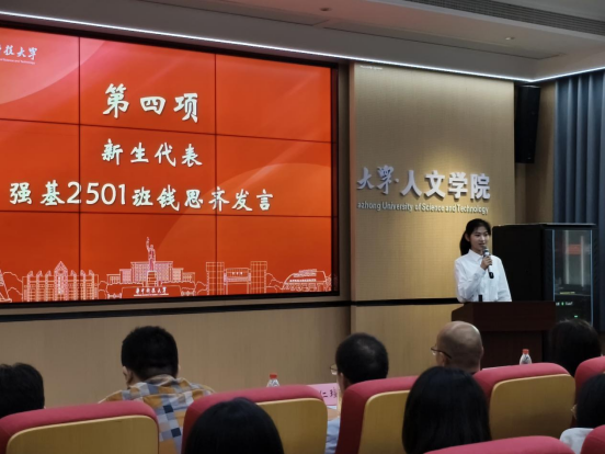 教师代表谭杉杉以余华《18 岁出门远行》切入,与新生探讨成长蜕变,指出科技为人文提供新土壤,人文是科技发展的重要根脉。她通过经典哲理,鼓励新生以文学赋予的勇气,永远坚定、澄澈、充满力量,在未来迎来属于自己的文学时刻。