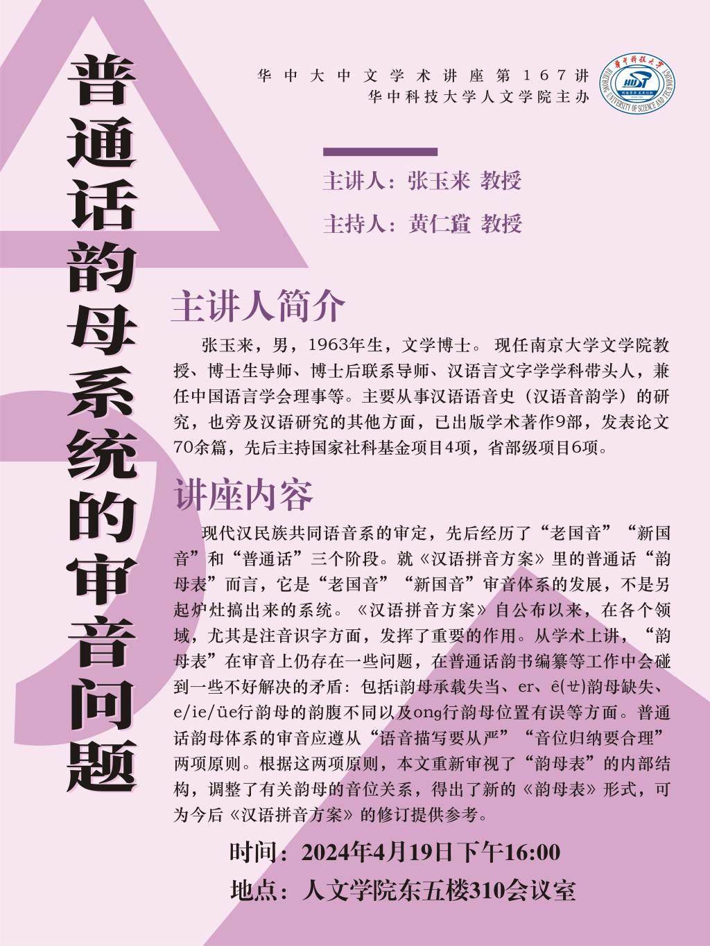 华中大中文学术讲座第167讲:普通话韵母系统的审音问题