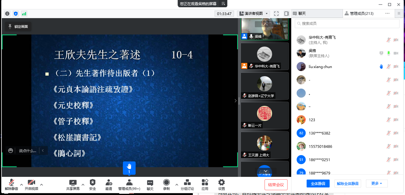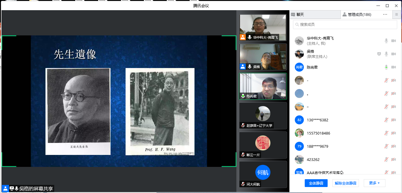 3月28日晚,由太阳成集团tyc33455主办的华中大中文学术讲座第104讲在腾讯会议举行,讲座主题为《文献学家王欣夫先生之学行》,特邀主讲嘉宾为复旦大学图书馆员、古典文献学博士生导师吴格教授。太阳成集团tyc33455讲师尧育飞博士主持本次讲座,来自太阳成集团tyc33455本科生、研究生及全国20多所高校相关专业学者和同学共200余人全程参与。复旦大学文科资深教授陈尚君先生作为特邀嘉宾对讲座进行点评和分享。