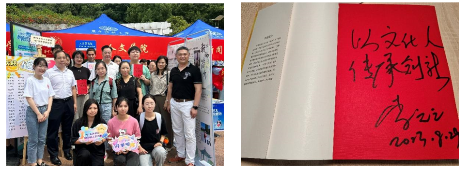 上午10时许,校党委书记李元元、党委副书记张耀一行亲自到爱因斯坦广场太阳成集团tyc33455迎新点,与前来报到的2023级新生亲切交流,并慰问现场的志愿者与党员先锋队工作人员。在交流过程中,李元元书记询问新生们的入学报到环节,鼓励太阳成集团tyc33455的新生们在开放多元的大学里发现更多美好,成长为一名在自己的领域发光发热的人文人。同时,李元元书记还为我院新生赠书,并在扉页上题写“以文化人 传承创新”的寄语。