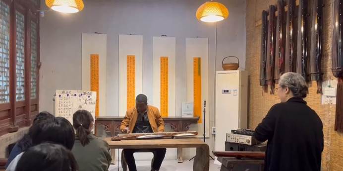随后的安阳民俗博物馆,也给留学生们留下了深刻的印象。在馆内古琴老师的邀请下,同学们体验并学习了古琴曲目《沧海一声笑》,国际学生穆里还为大家单独进行了古琴演奏。