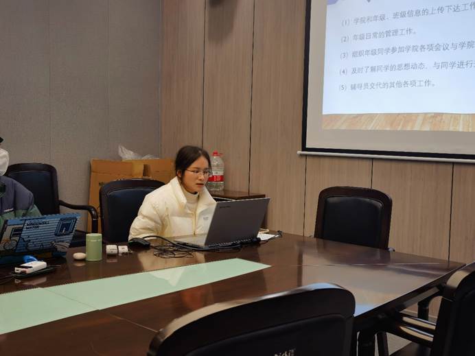 2022级横向和资助德育助理杨婉君主要从横向代班事务和纵向工作两个大的方面讲述了自己在上一学期工作经历,收获和自身的不足。横向代班中做好日常服务和事务提醒等工作,纵向工作做好学业助学金发放、困难认定、管理和考核三助岗位、参与组织研究生各类奖学金的评定等。