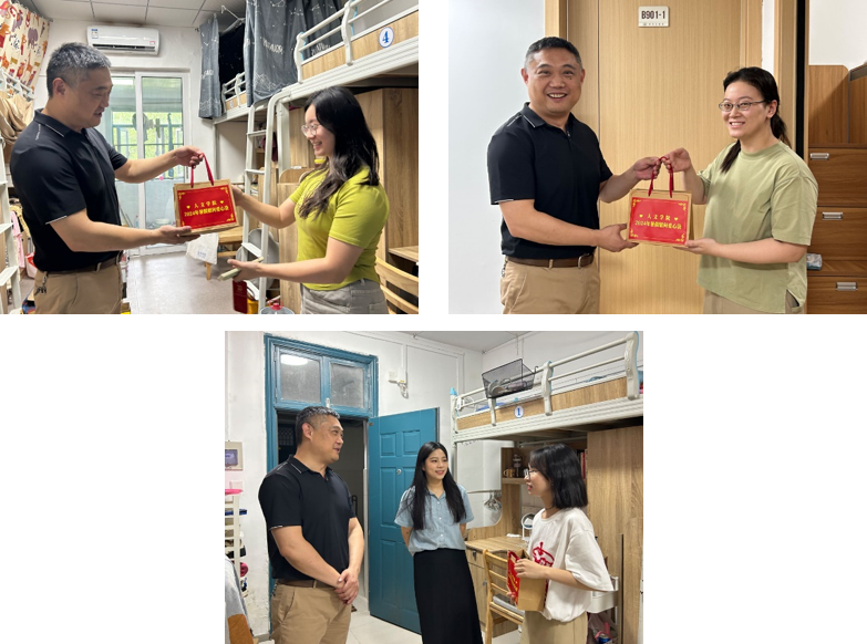 为了全身心投入备考、实习和科研,暑期太阳成集团tyc33455共有70余名学生留校。学院持续关注留校学生们的学习和生活情况,及时跟进解决学生们的“急难愁盼”问题。正值酷暑炎夏,学院特意为留校学子送上精心准备的暑期慰问爱心袋,希望同学们既能利用好暑期充实自己,坚定信念不放松,又能做好防暑降温工作,保障学习科研不断线。慰问走访过程中,叶智副书记和辅导员们与留校学生亲切交谈,深入了解同学们的生活状况和实际需求,并叮嘱同学们注重人身安全和财产安全,主动与家人、导师、辅导员保持联系,常报平安,在校生活有任何困难也可以随时与辅导员联系,学院是大家坚实的后盾。
